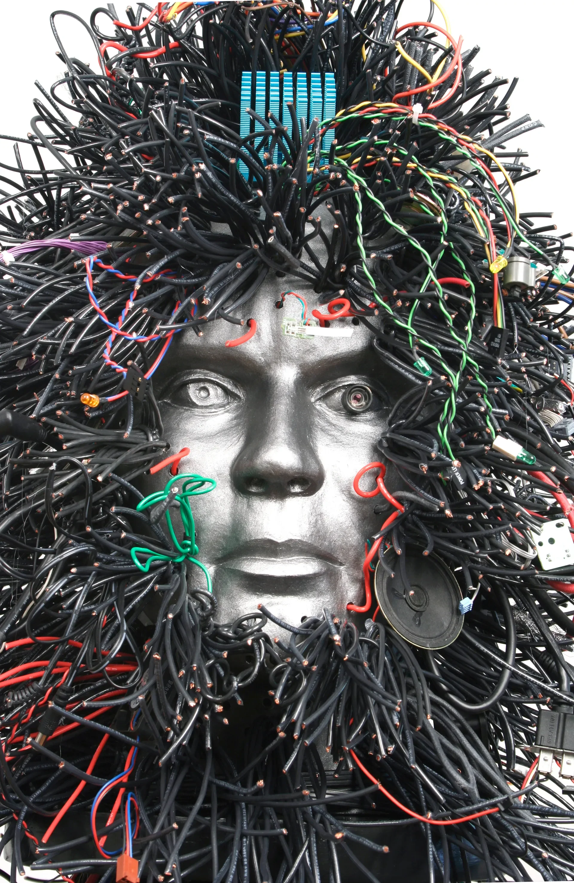Transhuman Personae #11, 2010, Fired clay, graphite and aluminum powders, acrylic medium, computer parts, cable, wire, tripod, 75 x 46 x 46