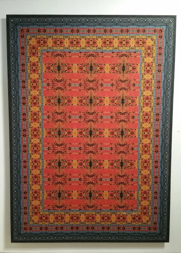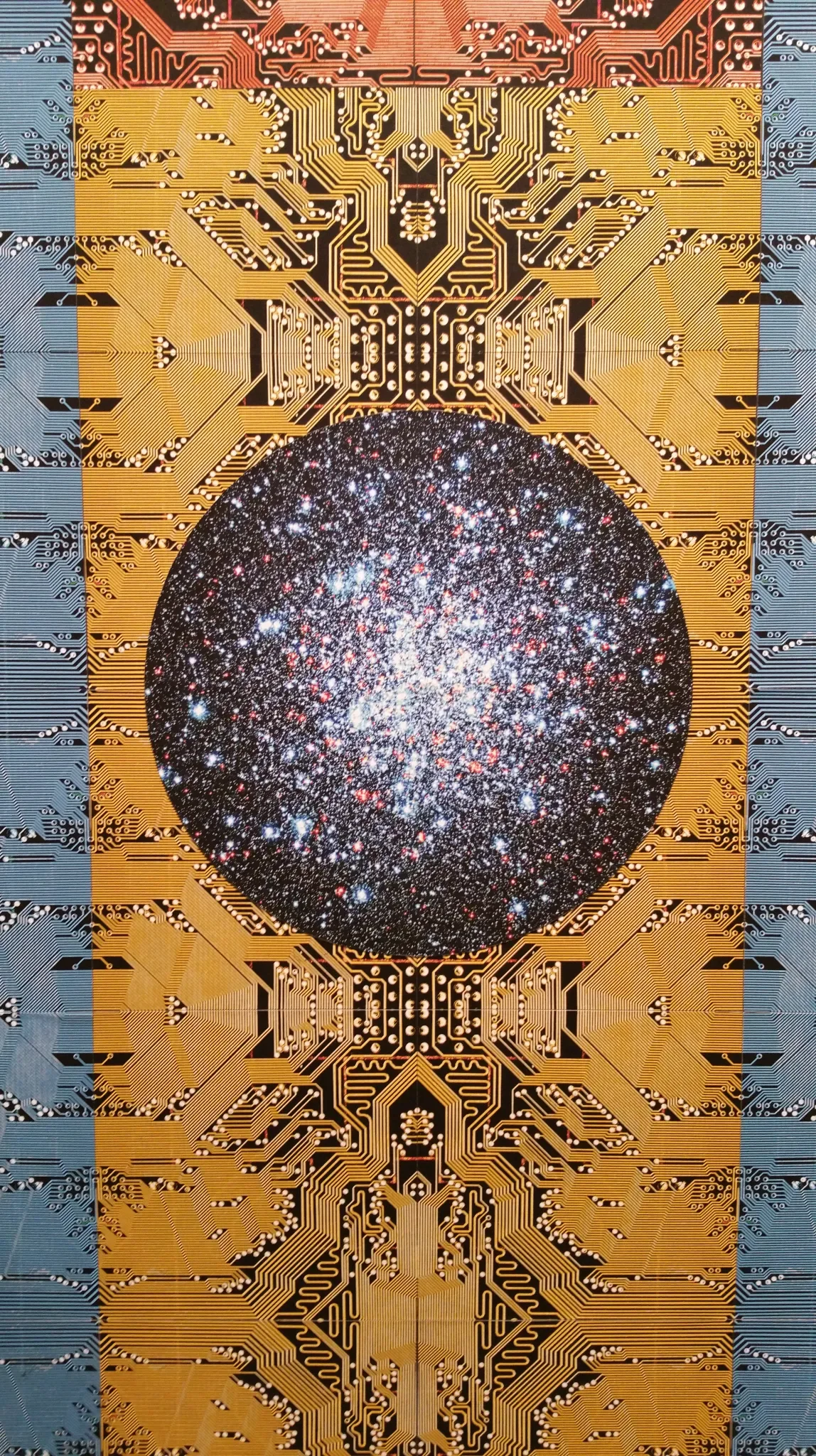 Constructed from digital photographs and the enlarged and altered images of computer motherboards, the meticulously composed and both formally and metaphorically layered scrolls feature numerical codes and details of electronic circuits in repetitive, ornamental structures. Reminiscent of the spiritual devices of Himalayan cultures, the painted and collaged scrolls replace pictures of Buddhist deities and narratives with abstract patterns of techno-scientific imagery. In Extreme Deep Field (2014) the artist framed the Hubble telescope’s iconic image of galaxies that are billions of years away from us with diagrammatic patterns of enlarged circuit boards fusing the infinitesimal and the interstellar as well as space and surface.