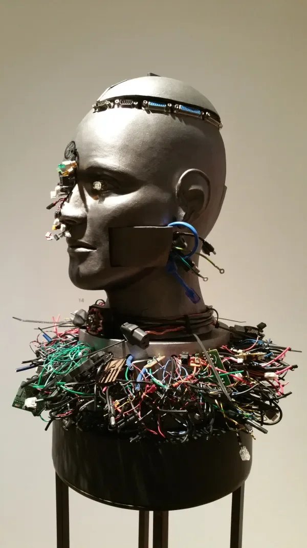 Yet innovation happens fast, and as it change happen, our ideas about transhumanism change, too. The funny thing about “Hybrid” is that the technology in the show already feels archaic. USB and printer connections are antiques in a wireless world; the flash drives that dangle from the heads of the busts are as anachronistic as a bone necklace. Many young people who are perpetually online will never see a chip. Cables have been cut, hardware has turned into vaporware, and interfaces have shrunk to the brink of invisibility. The wire as a metaphor for connectivity has given way, replaced by the five bars on the top corner of the phone, and the future transhuman subject, passively caught in the strands of an invisible web, will not resemble a cyborg. He’ll be indistinguishable from a man on the street in the age before computers. Only the structure of his consciousness will be different.