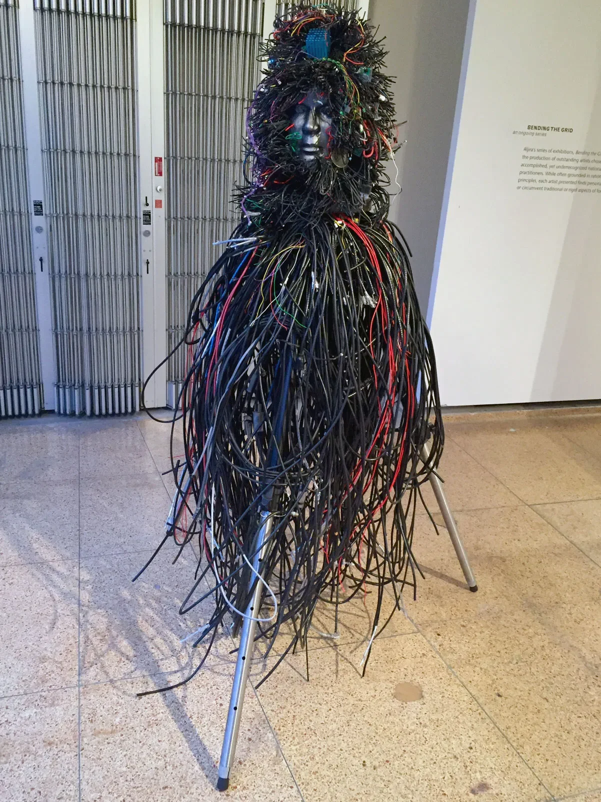 As I walked into Aljira art gallery in Newark, NJ to see Pat Lay’s newest exhibition, I was immediately greeted by a creature standing about the height of a human but made of tripod legs, an abundance of electrical wires, and other computer parts. The only human element was a silver face emerging out of the forest of black cords. Though there was something foreign about this piece it also felt very much familiar at the same time. And that’s when I realized that I just stepped into Pat Lay’s world.'